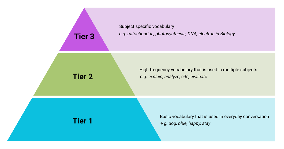 When it comes to teaching vocabulary, teachers mostly focus on Tier 3 words. Teaching Tier 3 words makes sense since students only encounter them within a specific subject and it is assumed that students have not come across these words before.