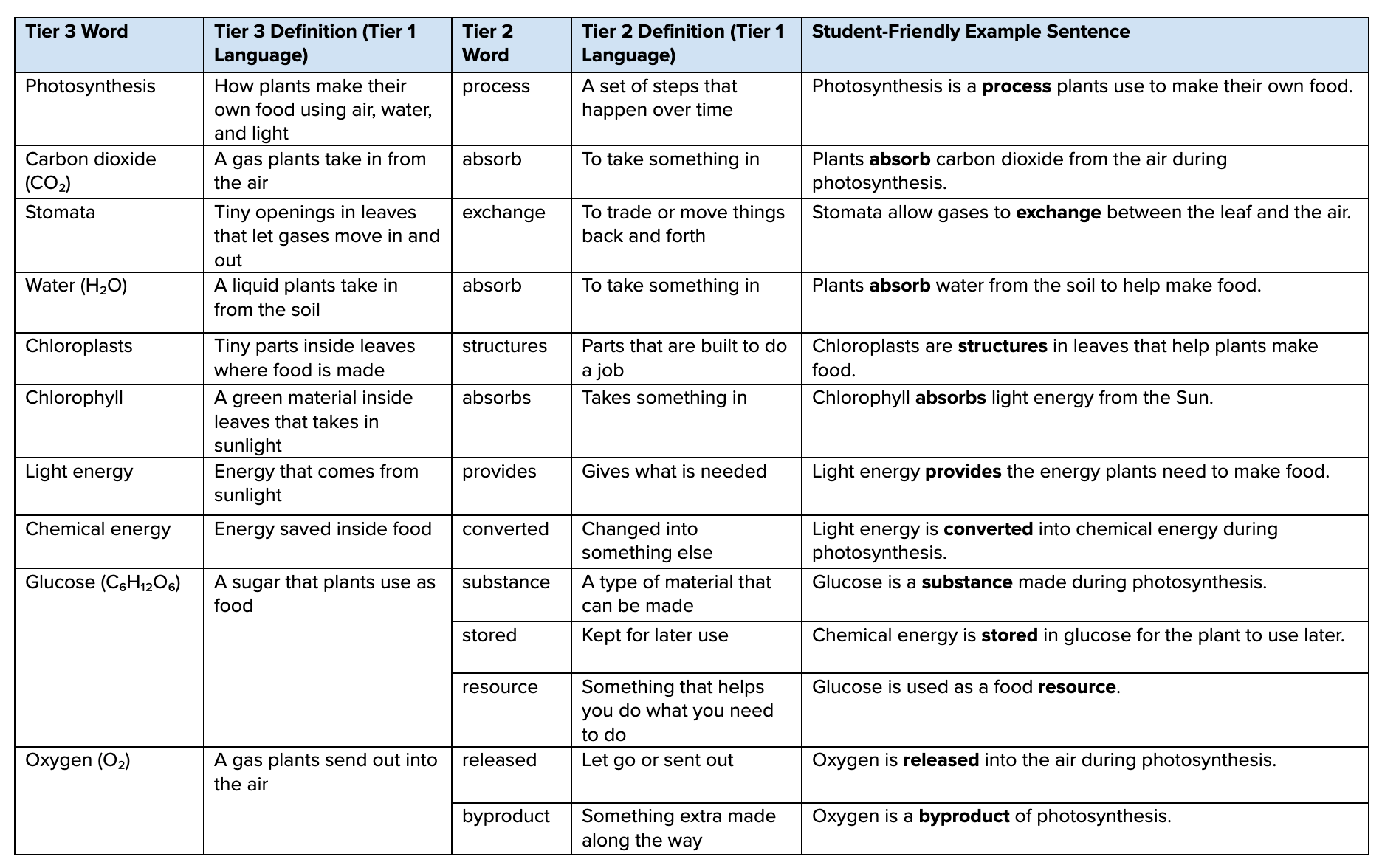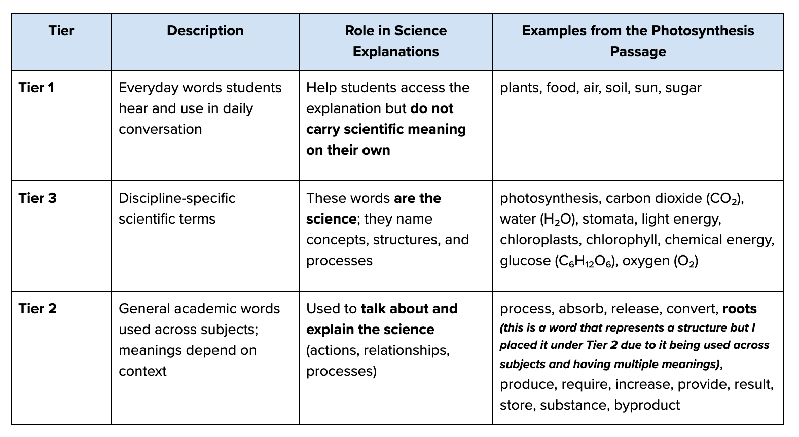 Tier 3 words such as photosynthesis, carbon dioxide, stomata, etc. are the science. In contrast, Tier 2 words such as process, absorb, substance, converted, etc. tend to talk about the science.
